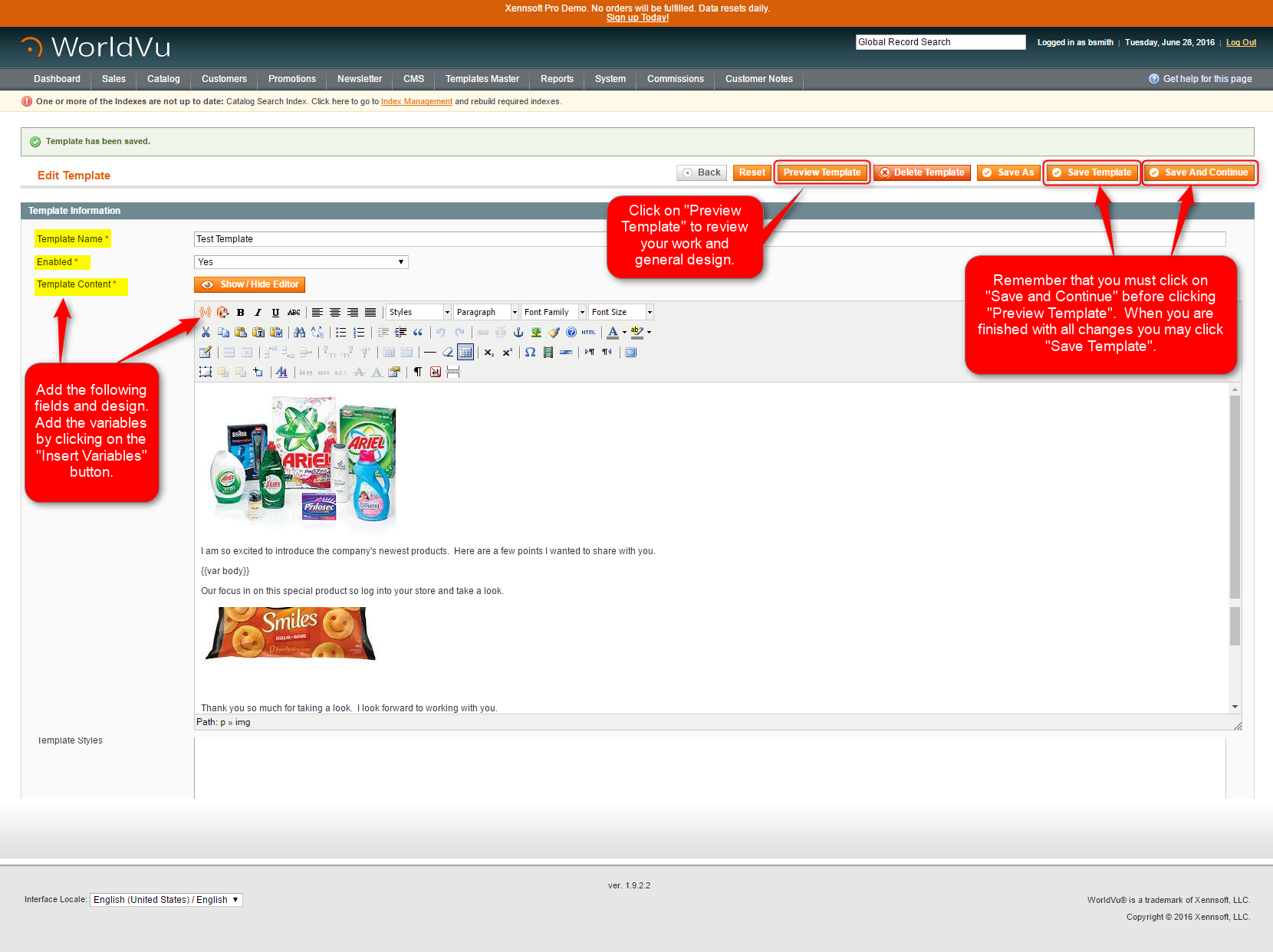 - Click “Preview Template” to review changes (You must click “Save and Continue” first in order to save any changes or they will not show in the Preview)