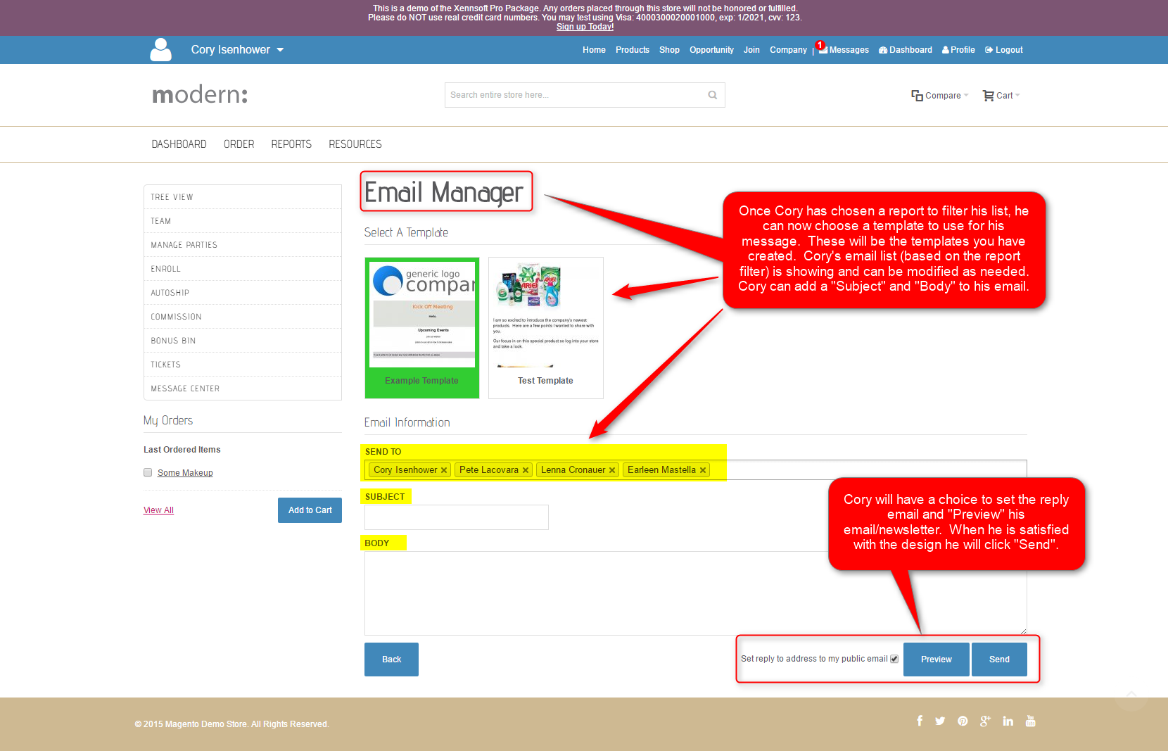 Based on the available reports created and allowed in the “Reports” area of the Team Office dashboard the associate/distributor will have additional ways to select specialized groups to whom they can send the email/newsletter templates. You (Corporate Admin) must create those reports in CMS > Team Office Reports in order for options to be available for your associates/distributors. If these reports are created they will allow the associate/distributor to filter their downlines to be used in the “Email Manager” communication options otherwise your associates/distributors will only be able to email their personally enrolled downline showing in their “Team” report.