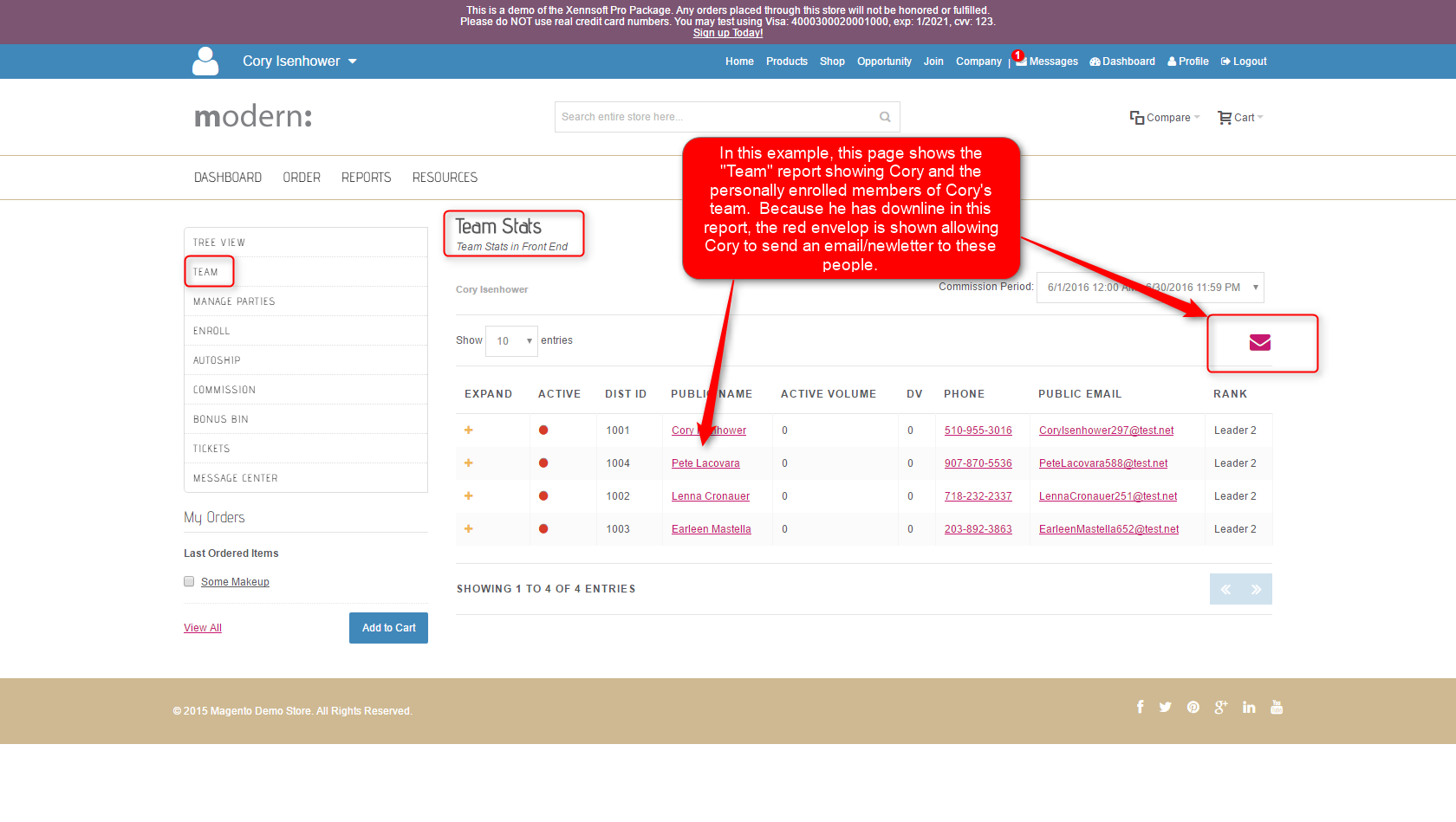 Note: You may view the template in Team Office by checking an associate’s/distributor’s account. Click on “Team” to view page. This will show the personally enrolled downline. If there is no downline then there will not be an option to send an email/newsletter. If downline are present, Click on the red envelop to open template options.